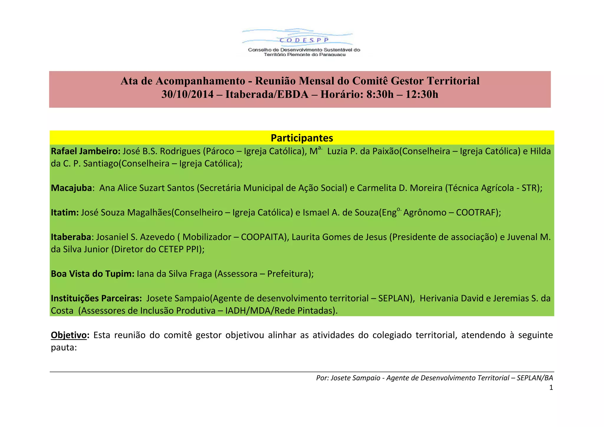 Este documento relata as atas de uma reunião do Comitê Gestor Territorial realizada em 30 de outubro de 2014 em Itaberaba, Bahia. A reunião discutiu o consórcio público territorial, a agenda de reuniões municipais e das câmaras temáticas, e definiu as próximas etapas do trabalho do comitê.