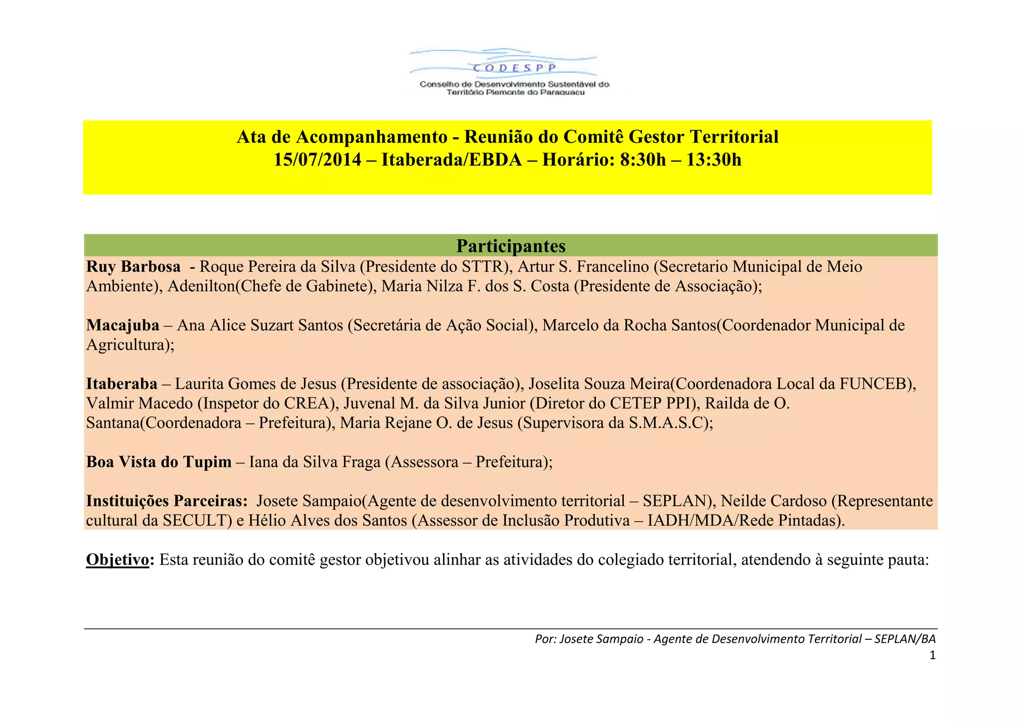 A reunião do comitê gestor teve como objetivo alinhar as atividades do colegiado territorial. Foi decidido que o prefeito Gidu liderará os esforços para estabelecer um consórcio público territorial. As câmaras temáticas se reunirão em datas específicas para discutir assuntos como cultura, agricultura, juventude e educação. Uma proposta para equipamentos de feiras da agricultura familiar foi apresentada e uma reunião foi agendada para fechar a proposta técnica visando o PROINF 2014.