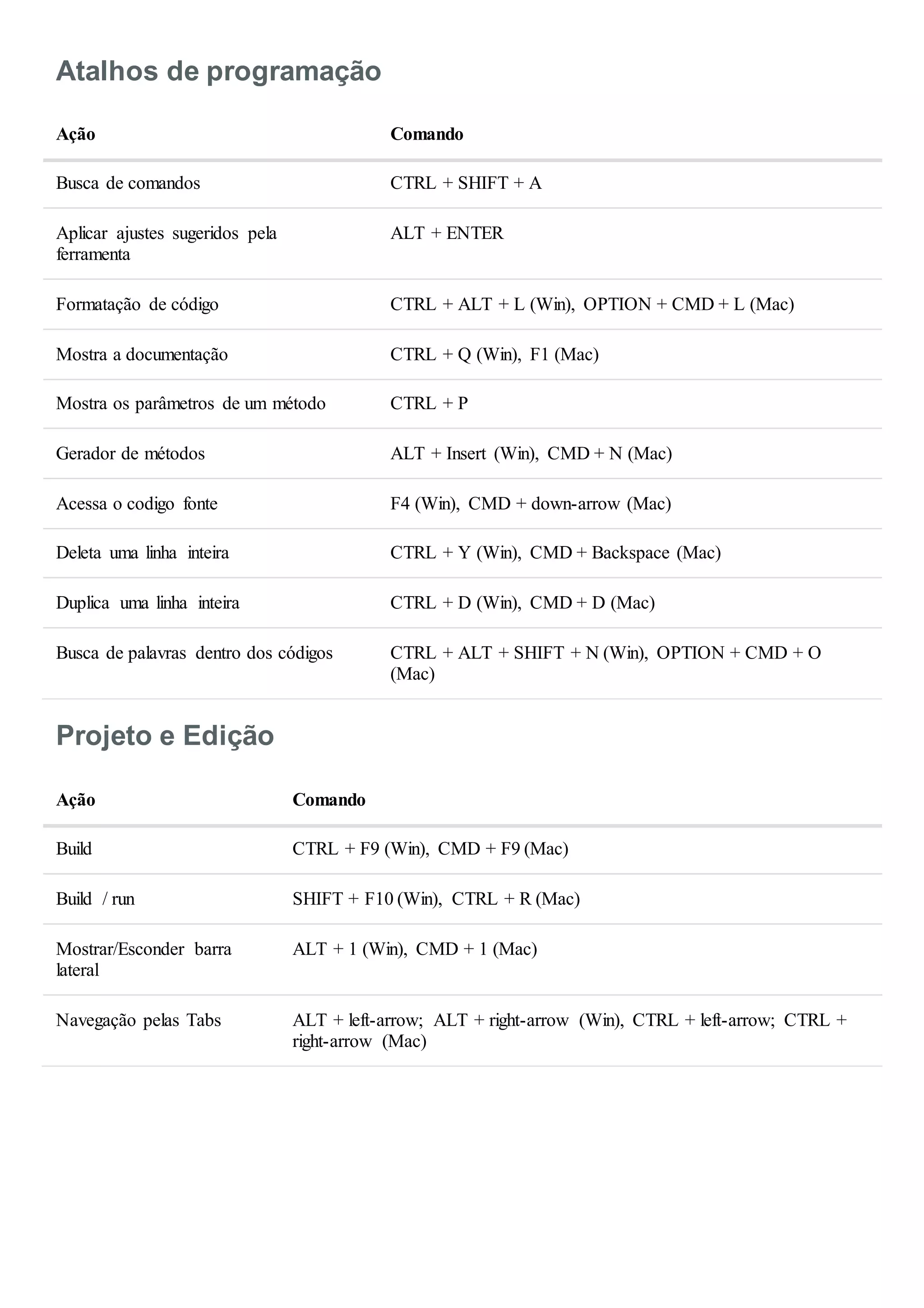 Os principais atalhos de programação para a ferramenta incluem: buscar comandos com CTRL + SHIFT + A, aplicar ajustes sugeridos com ALT + ENTER e formatar o código com CTRL + ALT + L. Outros atalhos úteis são mostrar a documentação com CTRL + Q, gerar métodos com ALT + Insert e acessar o código-fonte com F4.
