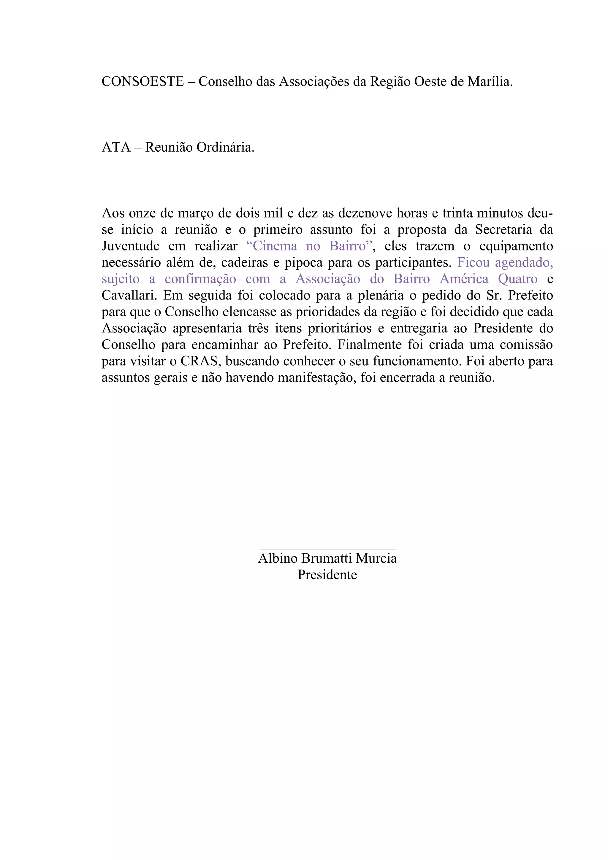 A reunião ordinária do CONSOESTE discutiu a proposta da Secretaria da Juventude de realizar sessões de cinema ao ar livre no bairro América Quatro e Cavallari, desde que confirmado com as associações de bairro. Também decidiu que cada associação apresentaria três itens prioritários para a região ao prefeito. Uma comissão foi criada para visitar o CRAS e conhecer seu funcionamento.