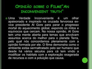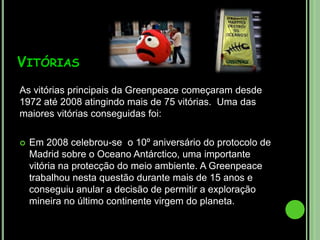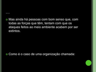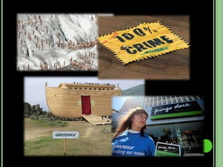 O documento discute ataques ao meio ambiente como poluição e caça ilegal, e defesas como a organização Greenpeace. Greenpeace usa campanhas pacíficas para proteger a natureza e promover soluções sustentáveis, tendo conquistado vitórias como impedir mineração na Antártida. O filme "Uma Verdade Inconveniente" também alerta para os perigos das mudanças climáticas.