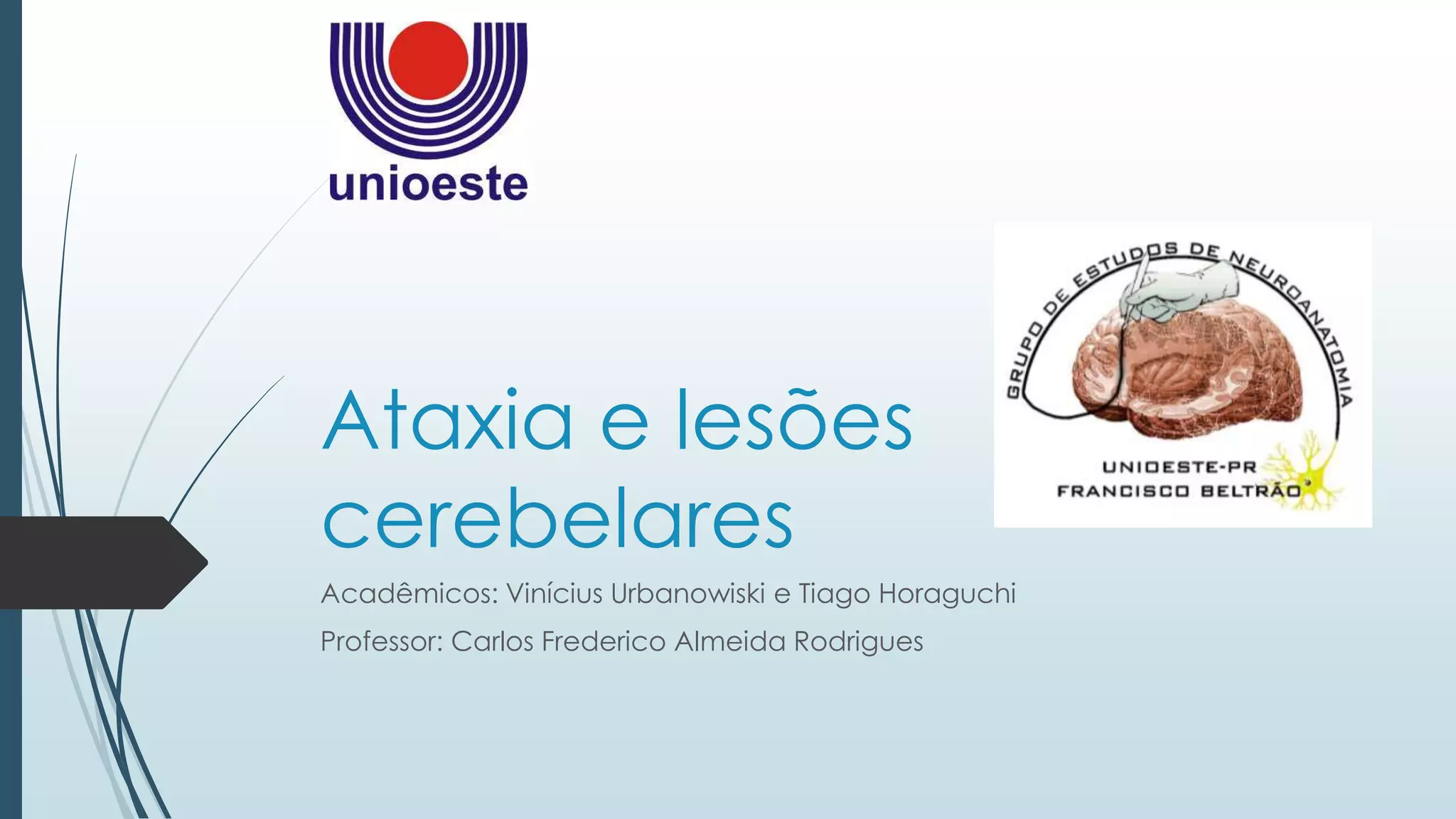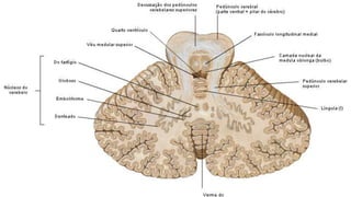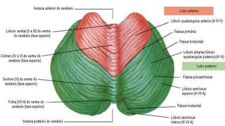 O documento discute as funções do cerebelo e os sintomas associados a lesões cerebelares, incluindo ataxia, perda de equilíbrio, hipotonia e alterações na marcha. O cerebelo coordena movimentos e mantém o equilíbrio muscular através de circuitos de feedback. Lesões cerebelares podem causar ataxia, disartria e quedas devido à perda de coordenação motora fina.