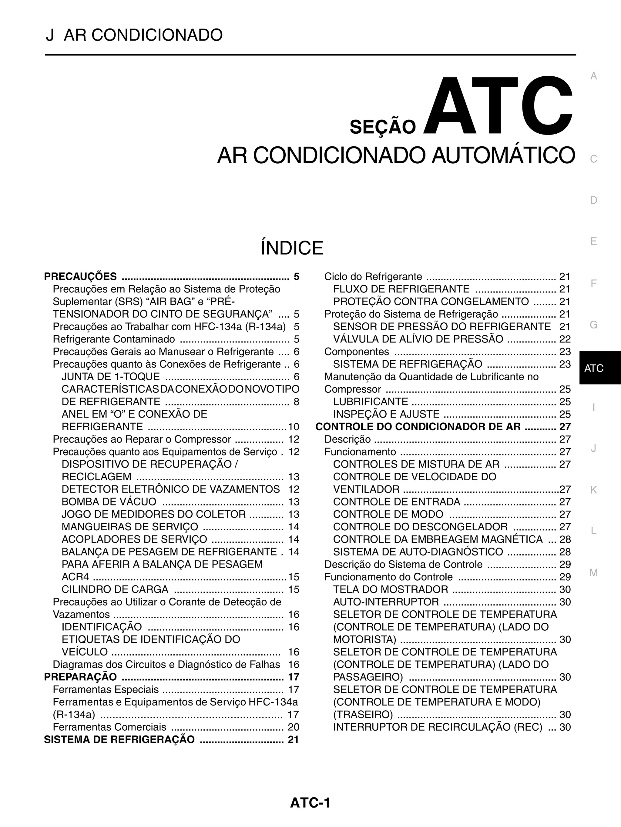2) São detalhadas as seções de precauções, preparação, sistema de refrigeração, controle do ar condicionado, diagnóstico de falhas e remoção/instalação de componentes.
