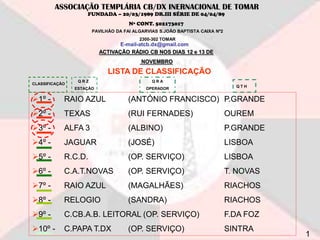 Este documento fornece uma lista de classificação para uma competição de rádio CB realizada nos dias 12 e 13 de novembro. A lista inclui o nome da estação, o operador e a classificação de 46 participantes de várias cidades portuguesas e um participante da África do Sul.