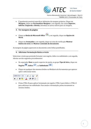 1) O documento fornece instruções sobre como formatar e inserir elementos como cabeçalhos, rodapés, números de página e datas em documentos do Microsoft Word; 2) Inclui etapas para criar e formatar listas, alterar margens e estilos de página; 3) Fornece detalhes sobre como remover formatação, cabeçalhos e rodapés de documentos.