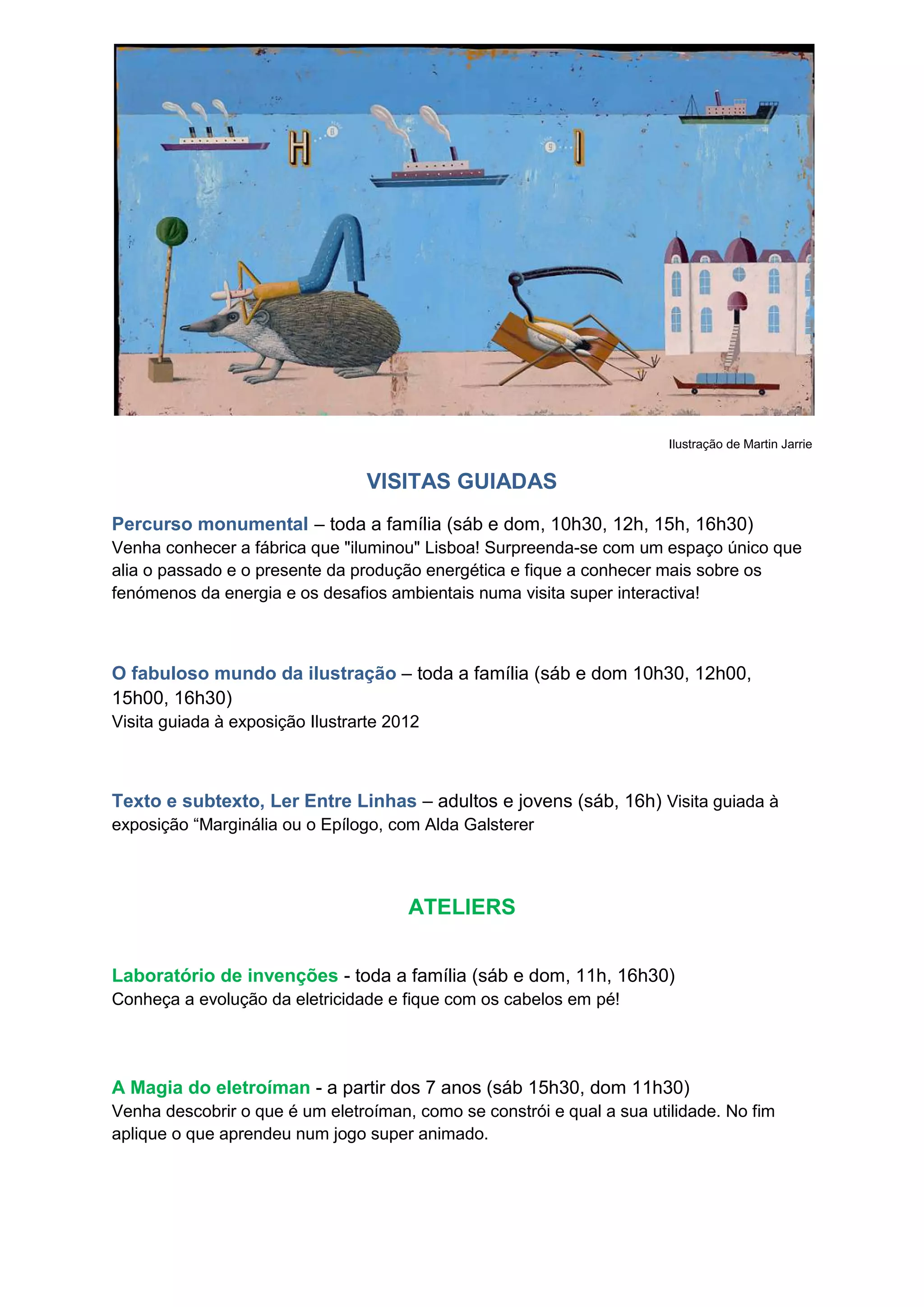 Este documento lista visitas guiadas e ateliês oferecidos por um museu sobre energia e ilustração. As visitas guiadas incluem percursos sobre a história da produção de energia, exposições de ilustração e leitura. Os ateliês ensinam sobre eletricidade, eletroímanes, criação de fábulas e histórias ilustradas. Todos são adequados para famílias e crianças de 6 a 12 anos.
