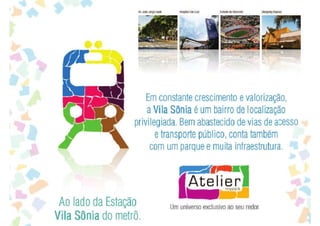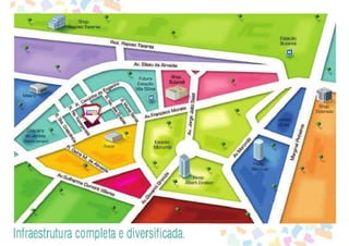 O documento apresenta um projeto arquitetônico para um empreendimento residencial e comercial na Avenida Professor Francisco Morato, cobrindo uma área de 4.588 m² com uma torre de 41 pavimentos e 272 apartamentos, além de 6 lojas. As unidades habitacionais variam de 63 m² a 120 m², e o projeto conta com diversas áreas comuns, como piscina, salão de festas e academia, além de infraestrutura moderna, como sistema de energia gerador e interfonia. A implantação inclui acessos para veículos e pedestres, e previsão de individualização das contas de água e gás.