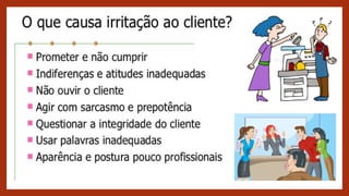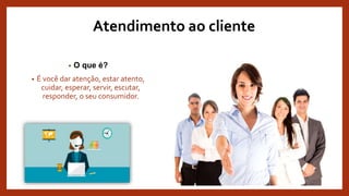 O documento fornece dicas e informações sobre a importância do atendimento ao cliente. Ele explica que o atendimento ao cliente envolve dar atenção, cuidado e servir o consumidor. Além disso, destaca que um cliente satisfeito influencia positivamente 5 novos clientes, enquanto um cliente insatisfeito influencia negativamente 20 clientes atuais. Por fim, fornece dicas para realizar um bom atendimento presencial e telefônico, como cumprimentar todos com um sorriso e escutar o cliente com atenção.