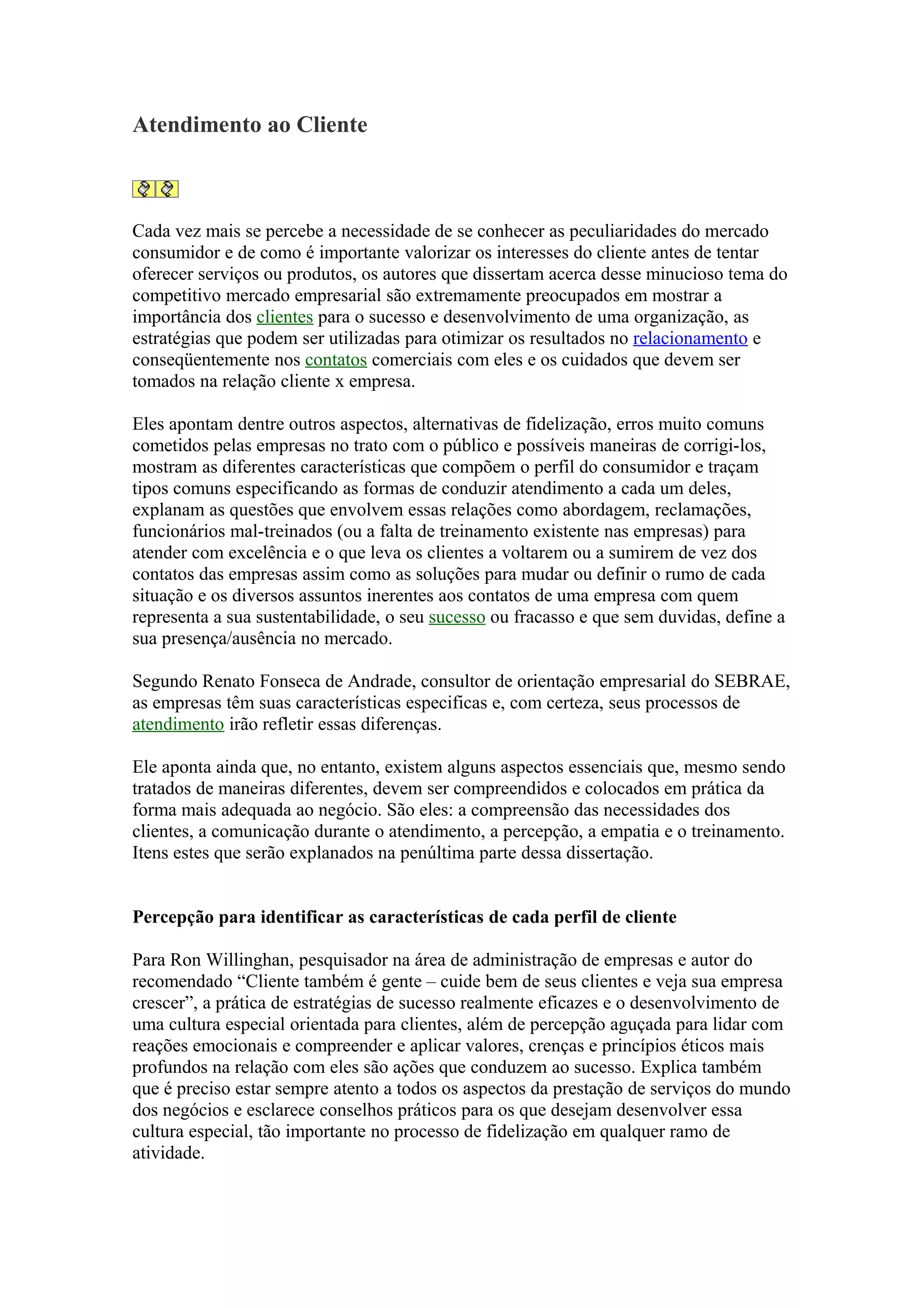 O documento discute a importância do atendimento ao cliente para o sucesso das empresas. Aponta que compreender as necessidades dos clientes, comunicar-se efetivamente e ter percepção e empatia são aspectos essenciais para o relacionamento com os clientes. Também discute estratégias para conquistar e fidelizar clientes, como identificar seus perfis e comportamentos de consumo.