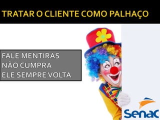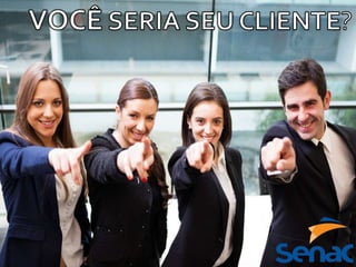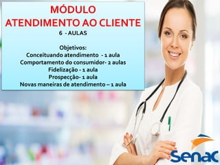 O documento discute o primeiro módulo e a primeira aula de um curso sobre atendimento ao cliente. A primeira aula conceitua atendimento ao cliente e discute como recepcionar, agilizar, informar e orientar clientes de forma eficiente através de boas posturas e atitudes como olhar nos olhos, sorrir e tirar dúvidas rapidamente.