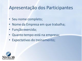 O documento apresenta um treinamento sobre atendimento de alta qualidade. O treinamento introduz o tema e objetivo, define conceitos como atendimento e tratamento, e discute momentos da verdade e como superar as expectativas dos clientes através de valor agregado.
