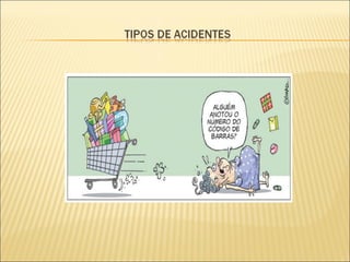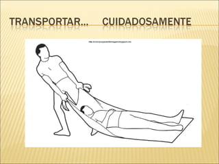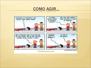 O documento descreve os procedimentos básicos de primeiros socorros, incluindo definir vítimas, socorristas e curiosos; avaliar a vítima para identificar riscos à vida; prestar os primeiros socorros sem agravar lesões até a chegada de atendimento médico; e sinalizar adequadamente o local do acidente.