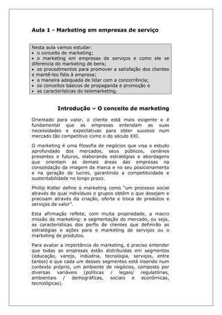 Este documento discute conceitos fundamentais de marketing, com foco no marketing de serviços. Apresenta as diferenças entre marketing de bens e serviços, destacando a intangibilidade dos serviços. Explora como as características dos serviços, como heterogeneidade e simultaneidade de produção e consumo, afetam a gestão do marketing.