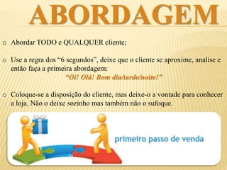 O documento fornece diretrizes para vendas e atendimento ao cliente, incluindo abordar todos os clientes de forma calorosa, fazer perguntas para conhecer melhor suas necessidades, demonstrar os produtos destacando seus benefícios, contornar objeções de forma gentil, fechar a venda do produto principal e então sugerir itens adicionais, antes de finalizar a transação de forma agradável.
