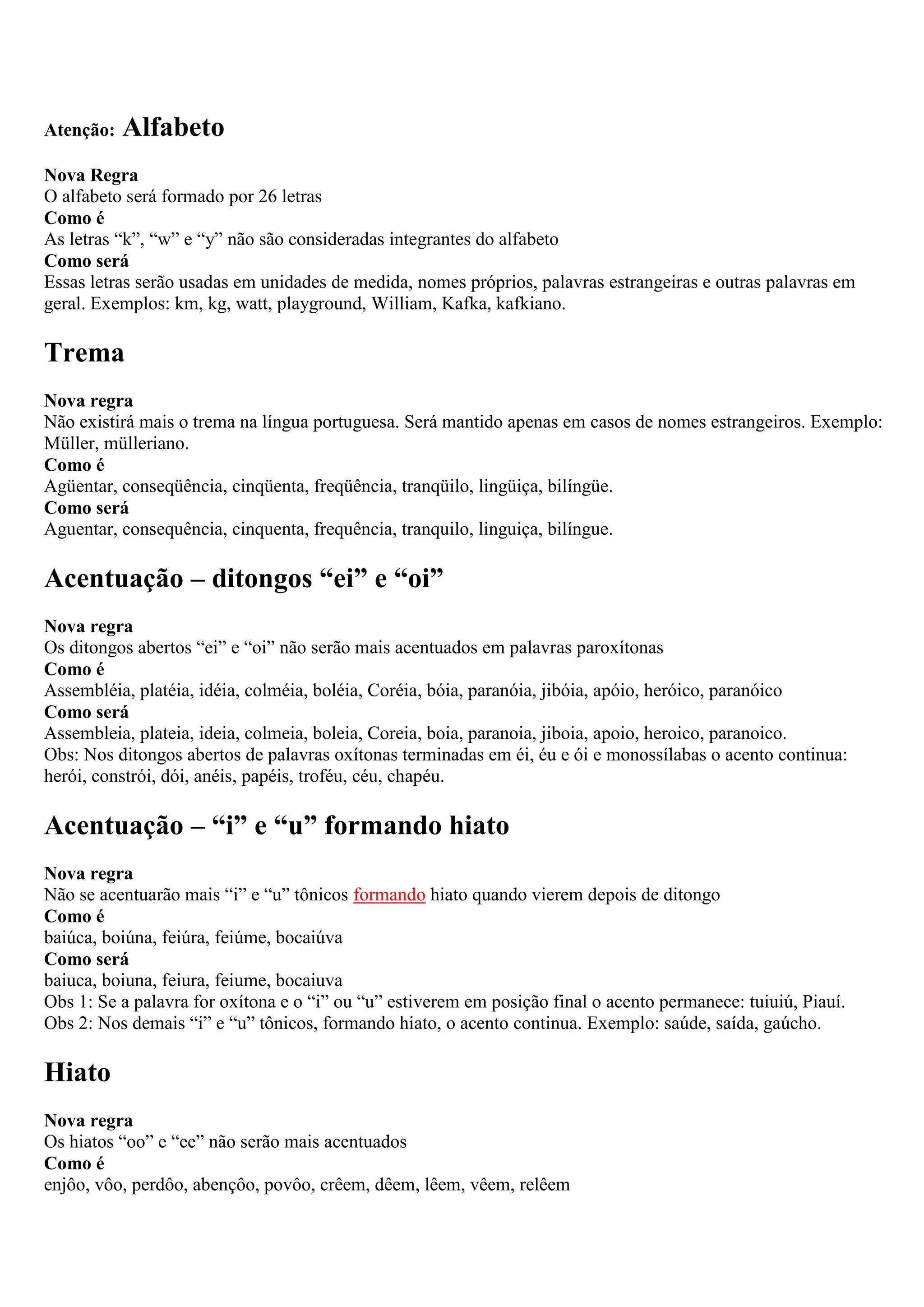 As principais mudanças nas regras ortográficas incluem: 1) retirar letras como "k", "w" e "y" do alfabeto, exceto em palavras estrangeiras e unidades de medida; 2) eliminar o trema em todos os casos, exceto em nomes estrangeiros; 3) remover acentos em ditongos abertos e na combinação "i-u", com exceções.