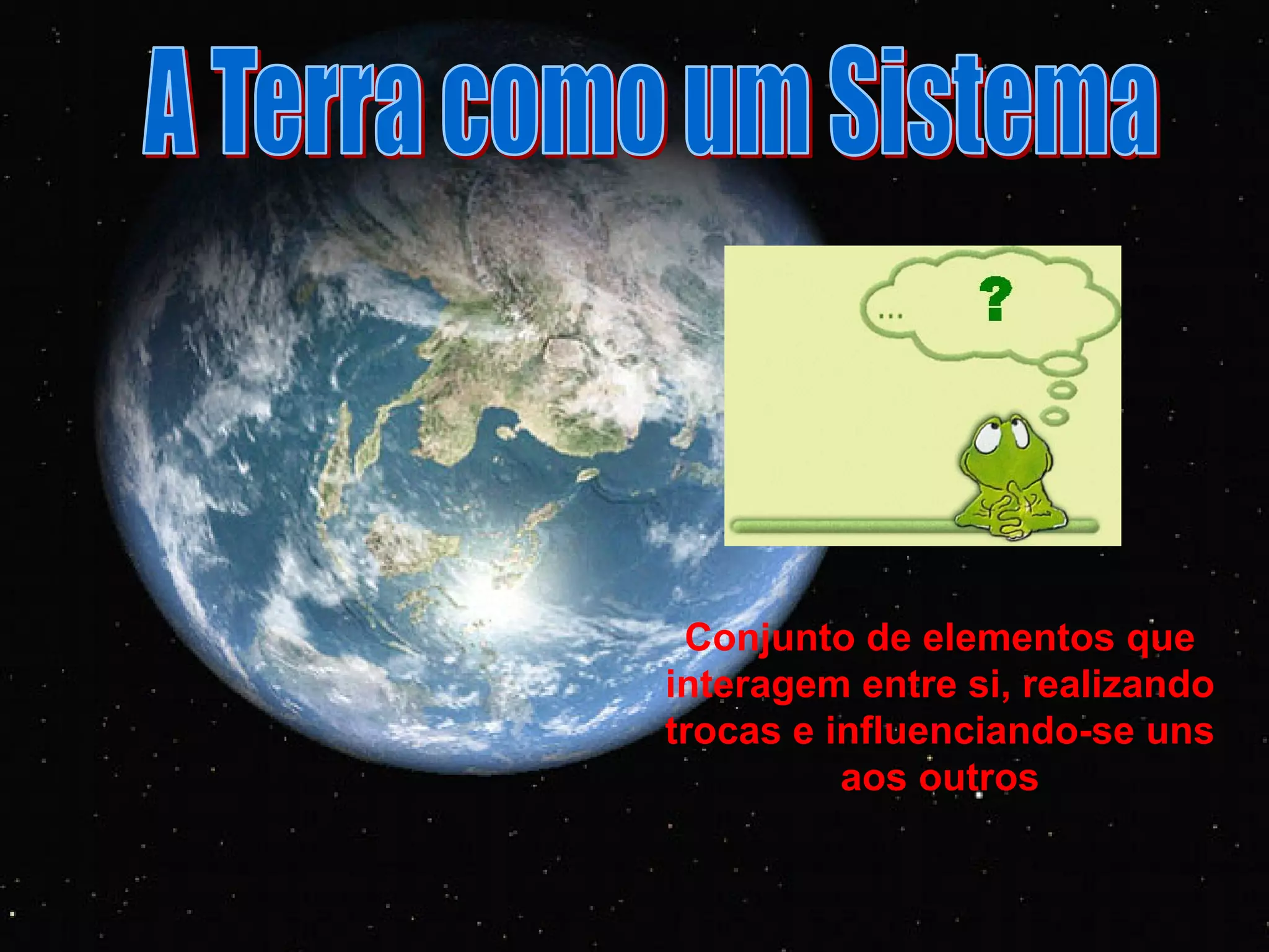 O documento descreve os quatro principais componentes da Terra - a atmosfera, hidrosfera, geosfera e biosfera - e como eles interagem como um sistema. Estes componentes estão interligados e alterações em um podem afetar os outros. A Terra é descrita como um grande sistema composto por estes componentes em interação.