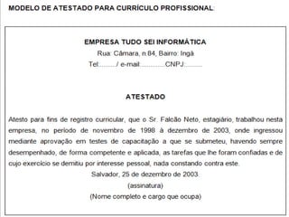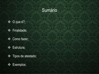 O documento discute o que é um atestado, sua finalidade e como fazê-lo. Um atestado é um documento que confirma ou nega uma situação ou fato sobre alguém. Sua finalidade é justificar faltas ou solicitar dispensas. Deve conter informações como nome, data e assinatura da autoridade que o emite.
