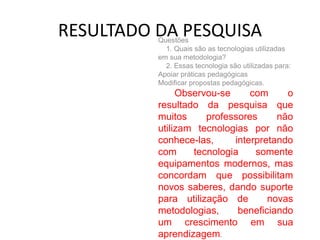 O documento discute como as tecnologias podem ser usadas para apoiar práticas pedagógicas e modificar propostas pedagógicas. A pesquisa mostrou que muitos professores não usam tecnologias por desconhecê-las, mas concordam que elas permitem novos saberes e apoiam novas metodologias, beneficiando o aprendizado.