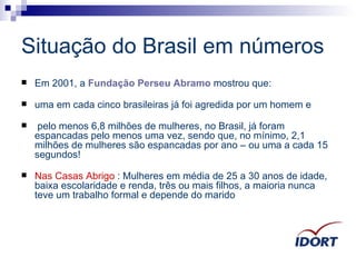 A violência doméstica contra a mulher é um grave problema no Brasil, com cerca de 6,8 milhões de mulheres agredidas a cada ano. As casas abrigo oferecem apoio temporário e capacitação profissional para essas mulheres e seus filhos, mas precisam de mais apoio do governo. O programa "Minha Casa, Minha Vida" pode ajudar a fornecer moradia permanente, especialmente para mulheres chefes de família.