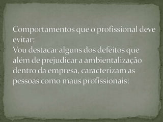 O documento discute as qualificações e comportamentos necessários para profissionais bem-sucedidos no mercado de trabalho atual. Ele enfatiza a importância de estar preparado para mudanças constantes, ter competências além de diplomas, e manter um equilíbrio emocional para lidar com problemas pessoais e profissionais. O documento também lista comportamentos como propagação de fofocas, egoísmo e falta de respeito que devem ser evitados.