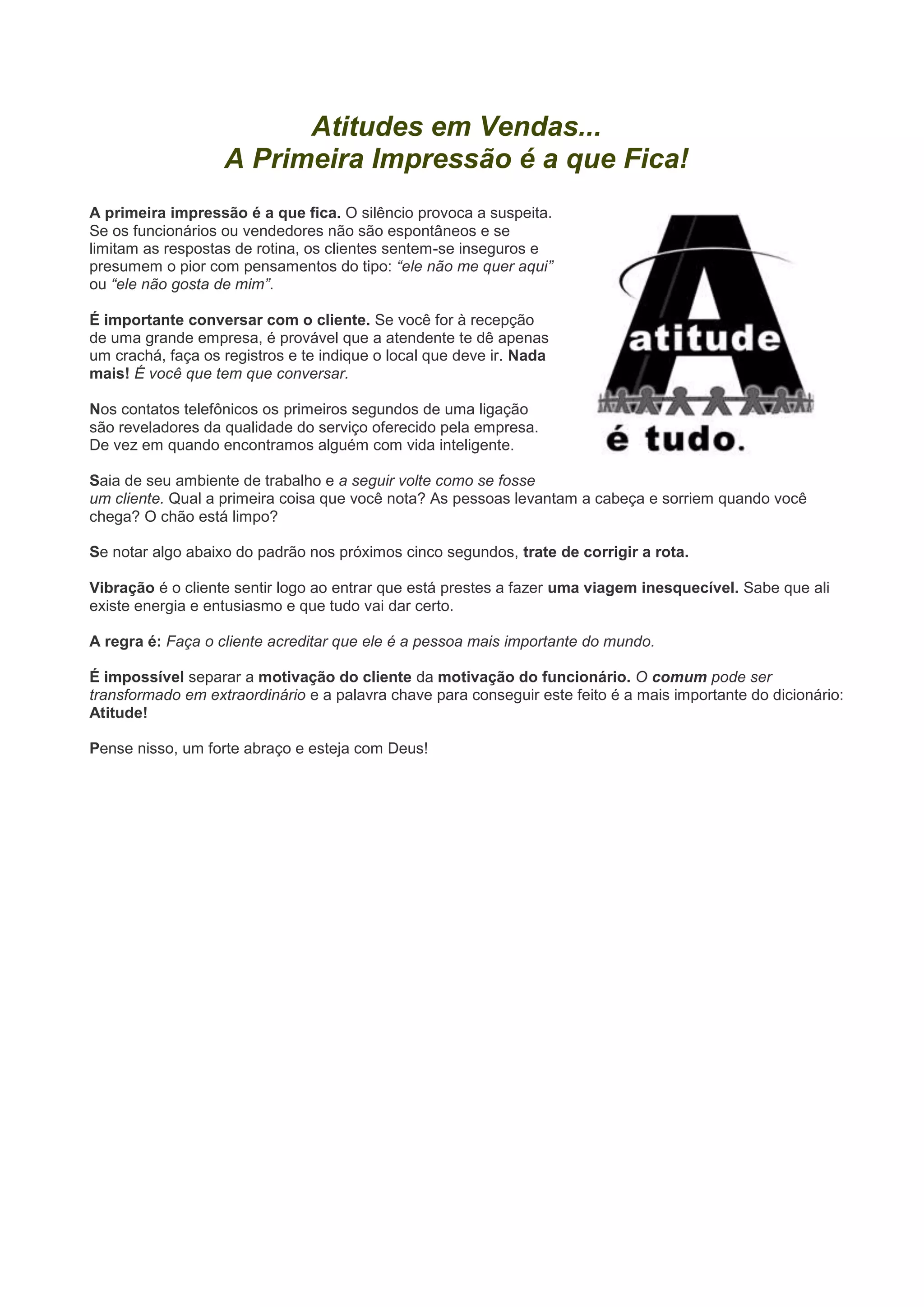 O documento discute a importância da primeira impressão e da atitude positiva para o sucesso das vendas. Ele enfatiza que os funcionários devem ser espontâneos com os clientes, conversar com eles e mantê-los sentindo-se a pessoa mais importante. Também ressalta que pequenos detalhes como sorrir e manter a limpeza influenciam a experiência do cliente.