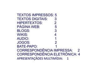 O documento lista os tipos e quantidades de recursos digitais e mídias usados por alunos em uma atividade sobre tecnologias educacionais, incluindo 5 textos impressos, 3 digitais, 2 hipertextos, 5 páginas da web, 3 blogs, 4 wikis, 1 áudio, 2 jogos, 1 bate-papo, 2 correspondências impressas e 4 eletrônicas, e 1 apresentação multimídia.