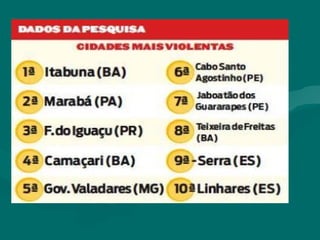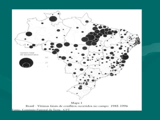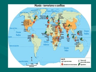 O documento discute diferentes tipos de conflitos: urbanos, rurais e mundiais. Apresenta possíveis causas de conflitos como desemprego, discriminação e diferenças de opinião. Detalha conflitos específicos como o do MST no Brasil, disputas entre países como Índia e Paquistão, e movimentos separatistas como o da ETA na Espanha.