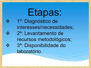 O documento descreve um projeto de apoio pedagógico em informática para professores de uma escola especial, que foi realizado em duas etapas de 4 horas cada através de palestras e experiências práticas no laboratório de informática da escola, e teve resultados satisfatórios ao aumentar o interesse e conhecimento dos professores sobre computadores.