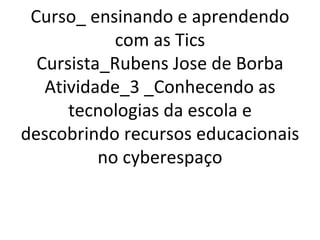 O documento descreve como as tecnologias são usadas na escola do autor, incluindo computadores para pesquisa e ensino, datashow para apresentações de vídeo e slides, e DVD/TV para exibição de filmes para tornar as aulas mais interessantes e ajudar os alunos a compreender melhor os conteúdos. Também lista as tecnologias disponíveis na escola, como datashow, DVD/TV, retroprojetor e laboratório de informática, sendo os equipamentos mais utilizados computadores, DVD/TV, datashow e apare
