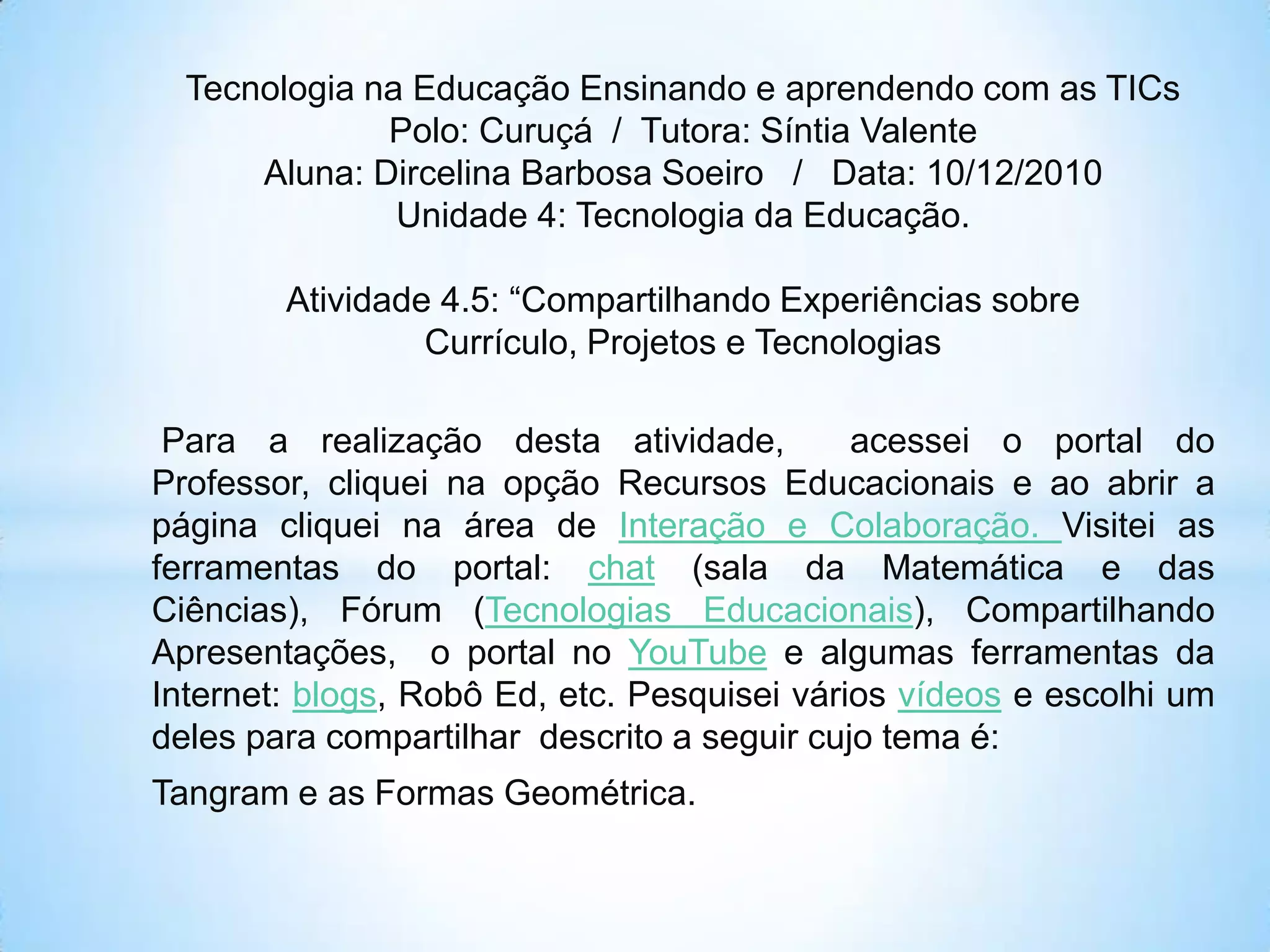 O documento descreve um vídeo sobre o Tangram e formas geométricas destinado a alunos do 7o ano. O vídeo ensina sobre a origem e significado do Tangram, apresenta formas geométricas e permite que os alunos construam seu próprio jogo de Tangram reconhecendo formas e ângulos. O documento elogia a integração da tecnologia no ensino e fornece links adicionais sobre o Tangram.