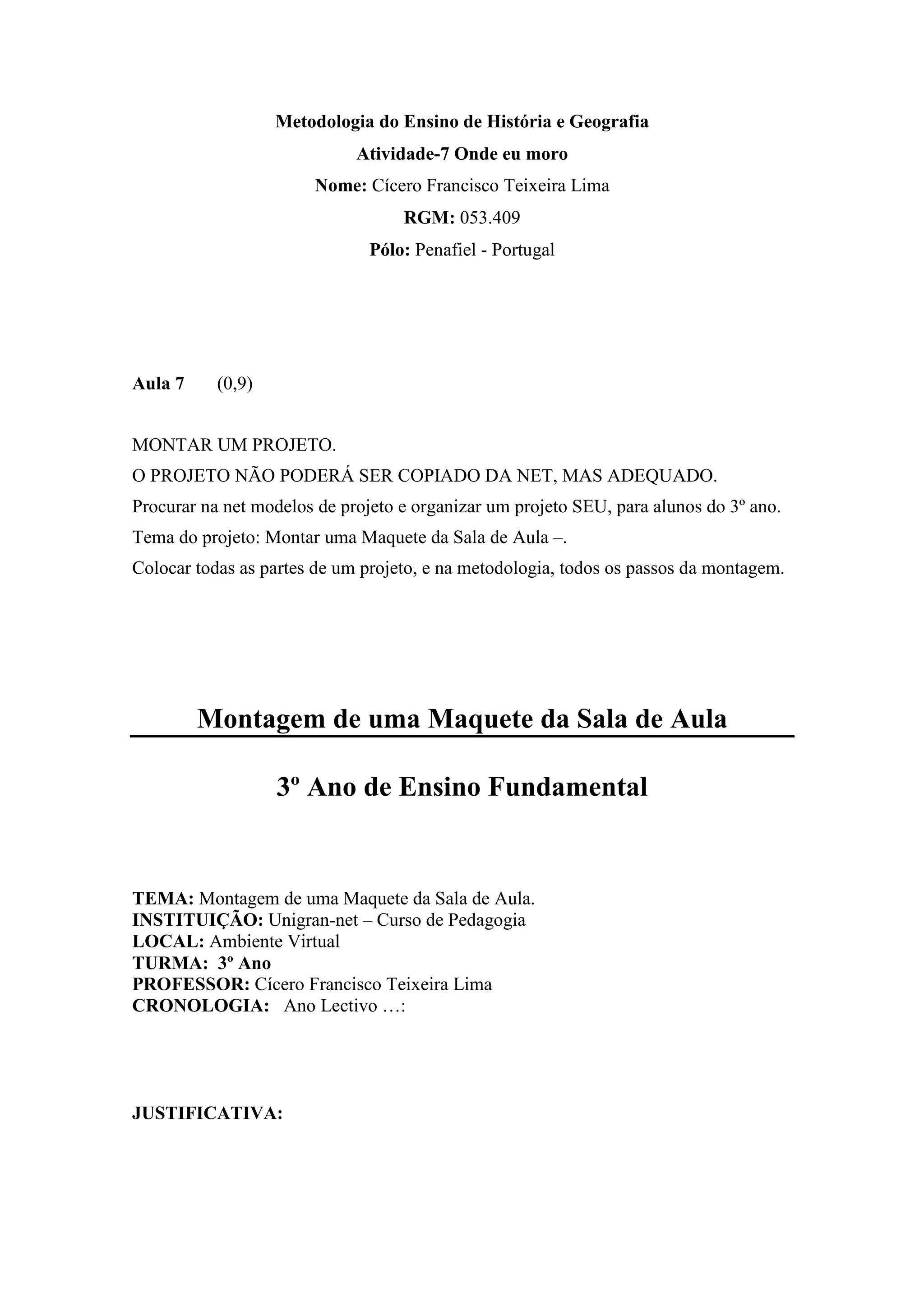 O documento propõe um projeto para alunos do 3o ano do ensino fundamental sobre a montagem de uma maquete da sala de aula. O projeto tem como objetivo levar os alunos a estudar de forma descontraída e prática, incentivar a criatividade, e desenvolver habilidades motoras e de trabalho em grupo. As atividades incluem recortes, colagem, pintura e montagem sob a orientação do professor ao longo de 5 períodos letivos.