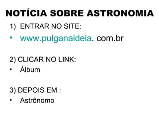 O documento fornece instruções para acessar uma notícia sobre astronomia em um site, e pede para ler a notícia e responder perguntas sobre as atividades profissionais de astrônomos e as características necessárias para a profissão.