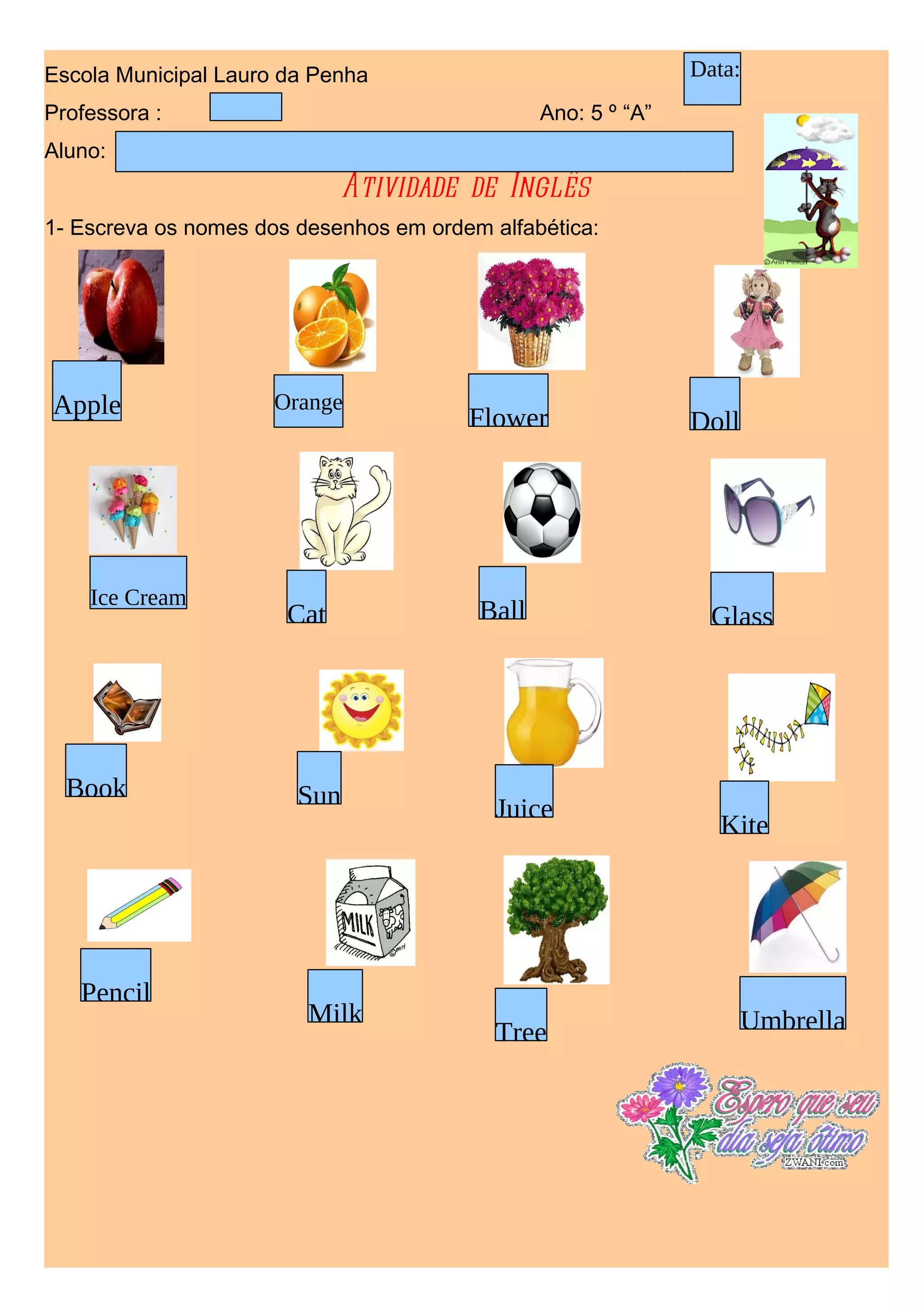 1- Escreva os nomes dos desenhos em ordem alfabética: