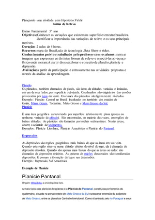Este documento descreve uma atividade planejada sobre as variações do relevo no Brasil para alunos do 5o ano do ensino fundamental. A atividade irá utilizar mapas, sala de tecnologia e vídeos para ensinar sobre planaltos, planícies e depressões e seu impacto no país. A avaliação será baseada na participação dos alunos e no que eles aprenderam.