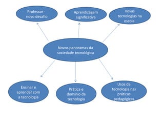 O documento discute os desafios de ensinar e aprender com tecnologia na escola, incluindo o uso de novas tecnologias e práticas pedagógicas significativas. Também aborda a necessidade de professores dominarem a tecnologia para aproveitar seus benefícios educacionais.
