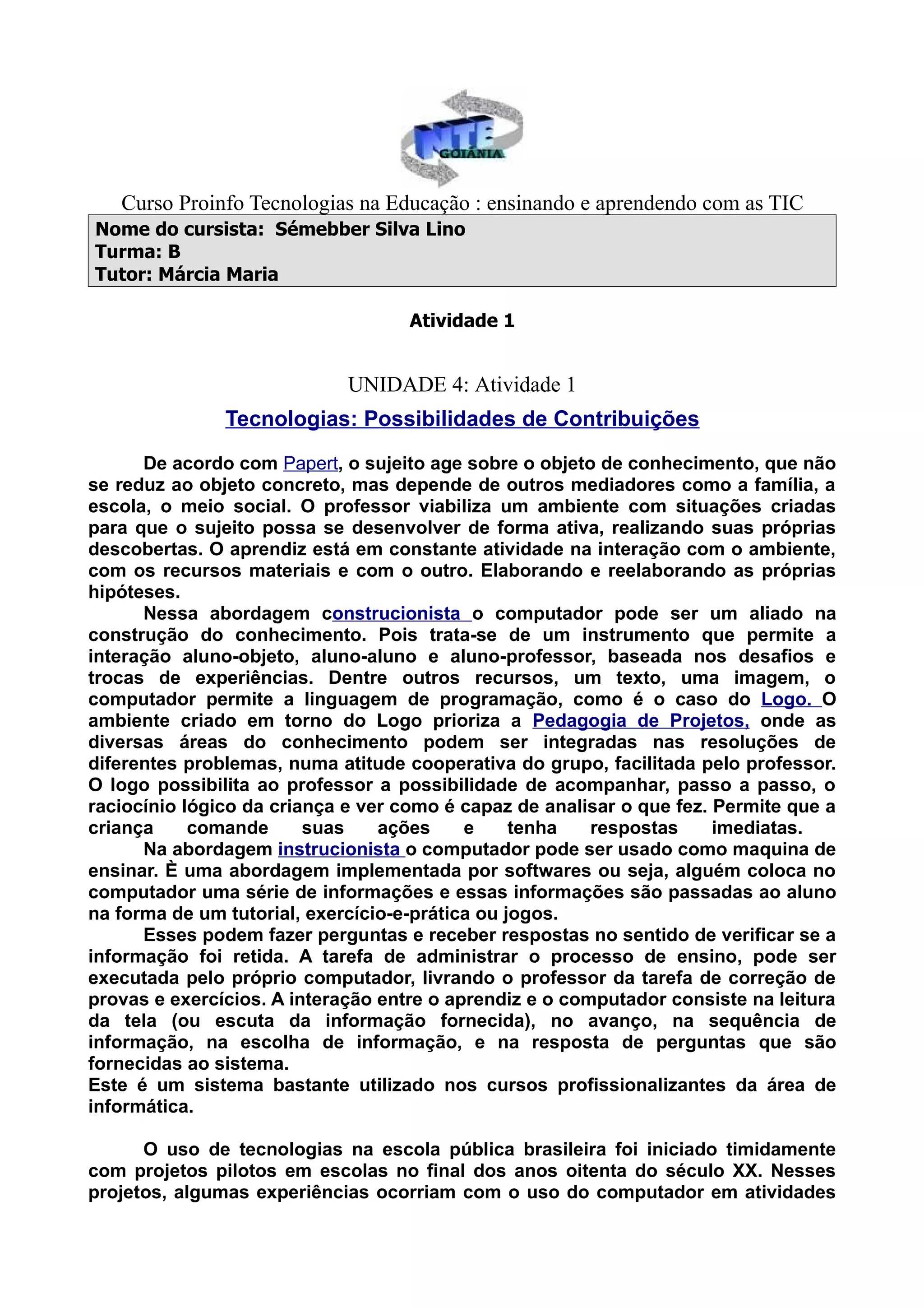 O documento discute como as tecnologias podem contribuir para a educação de acordo com as abordagens construcionista e instrucionista. A abordagem construcionista envolve os alunos como construtores ativos de seu próprio conhecimento por meio de atividades como programação com Logo, enquanto a abordagem instrucionista usa o computador para transmitir informações de forma mais passiva. O documento argumenta que as tecnologias podem ser usadas de forma positiva na educação quando usadas para estimular a criatividade e a aprendizagem ativa dos
