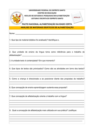 O documento analisa materiais didáticos de alfabetização do Pacto Nacional Pela Alfabetização na Idade Certa. Os materiais priorizam textos narrativos e atividades que direcionam as crianças a se posicionarem criticamente diante das propostas, sustentadas por uma concepção construtivista de ensino-aprendizagem e uma concepção sociocultural e interacionista de alfabetização.
