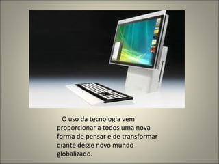 O documento discute como a tecnologia vem transformando a educação de maneiras positivas. Em três frases: A tecnologia proporciona novas formas de pensar e aprender em um mundo globalizado. Os métodos de ensino aliando tecnologia, praticidade e eficiência dinamizaram a didática dos professores e colocaram os alunos no controle do aprendizado. A tecnologia na educação, como data shows e apresentações digitais, é uma das maneiras mais eficazes de ensinar e os alunos garantem que é uma boa forma de