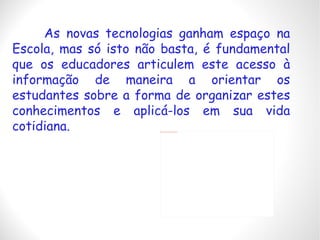 As novas tecnologias estão sendo introduzidas nas escolas, mas é essencial que os educadores orientem os estudantes sobre como organizar e aplicar esses conhecimentos em sua vida diária. Os educadores também precisam de formação contínua para revisar suas metodologias e adaptá-las às novas demandas, transformando o uso da tecnologia em sala de aula em ferramentas para construir conhecimento.