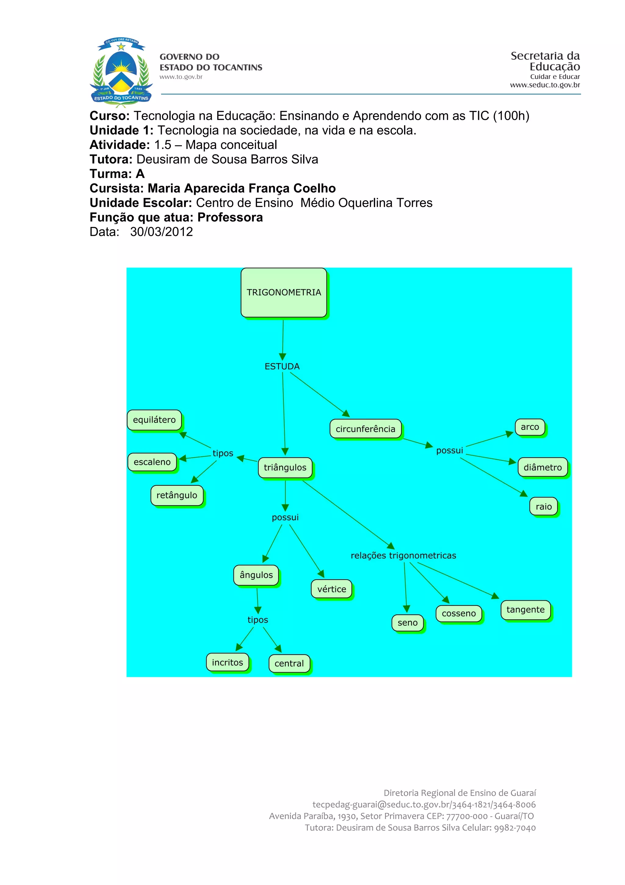 Este documento é um mapa conceitual realizado por Maria Aparecida França Coelho como parte da atividade 1.5 da Unidade 1 do curso Tecnologia na Educação: Ensinando e Aprendendo com as TIC ministrado pela tutora Deusiram de Sousa Barros Silva para a Turma A do Centro de Ensino Médio Oquerlina Torres em 30 de março de 2012.