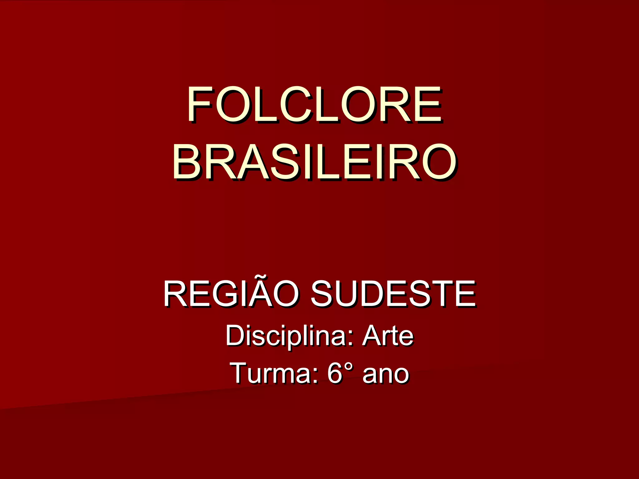 O documento apresenta o folclore da região Sudeste do Brasil, incluindo danças tradicionais como fandango e folia de reis, lendas populares, pratos típicos como feijoada e pão de queijo, bebidas como vinho e caipirinha, e artesanato em cerâmica e pedra-sabão.