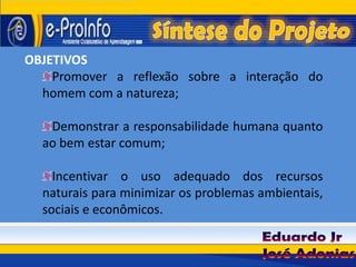 O documento descreve objetivos e metodologia para uma série de aulas sobre a interação do homem com a natureza. Os objetivos são promover a reflexão sobre o tema, demonstrar a responsabilidade humana pelo bem estar comum e incentivar o uso adequado de recursos naturais. A metodologia inclui vídeos, pesquisa na internet, criação de blog e hipertexto coletivo e troca de mensagens.