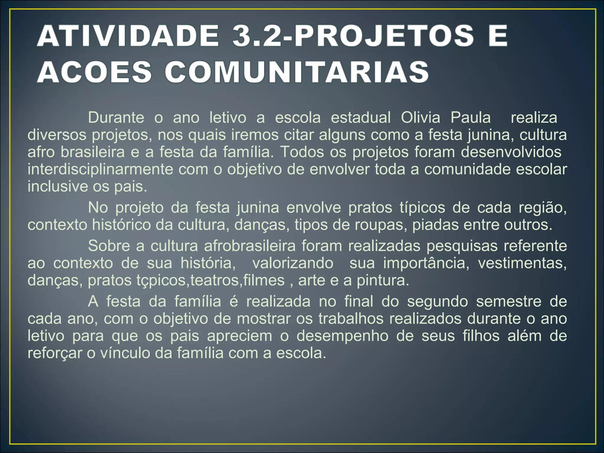 A escola estadual Olivia Paula realiza diversos projetos culturais e de envolvimento comunitário durante o ano letivo, incluindo uma festa junina, um projeto sobre cultura afro-brasileira e uma festa da família, todos desenvolvidos de forma interdisciplinar para envolver pais e alunos.
