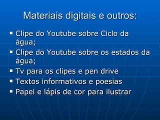 Este documento discute como ensinar estudantes sobre o ciclo da água e a importância de cuidar do meio ambiente. Vídeos do YouTube e textos serão usados para explicar onde a água vem, seus estados físicos e o ciclo hidrológico, com o objetivo de sensibilizar as crianças sobre a problemática da água.