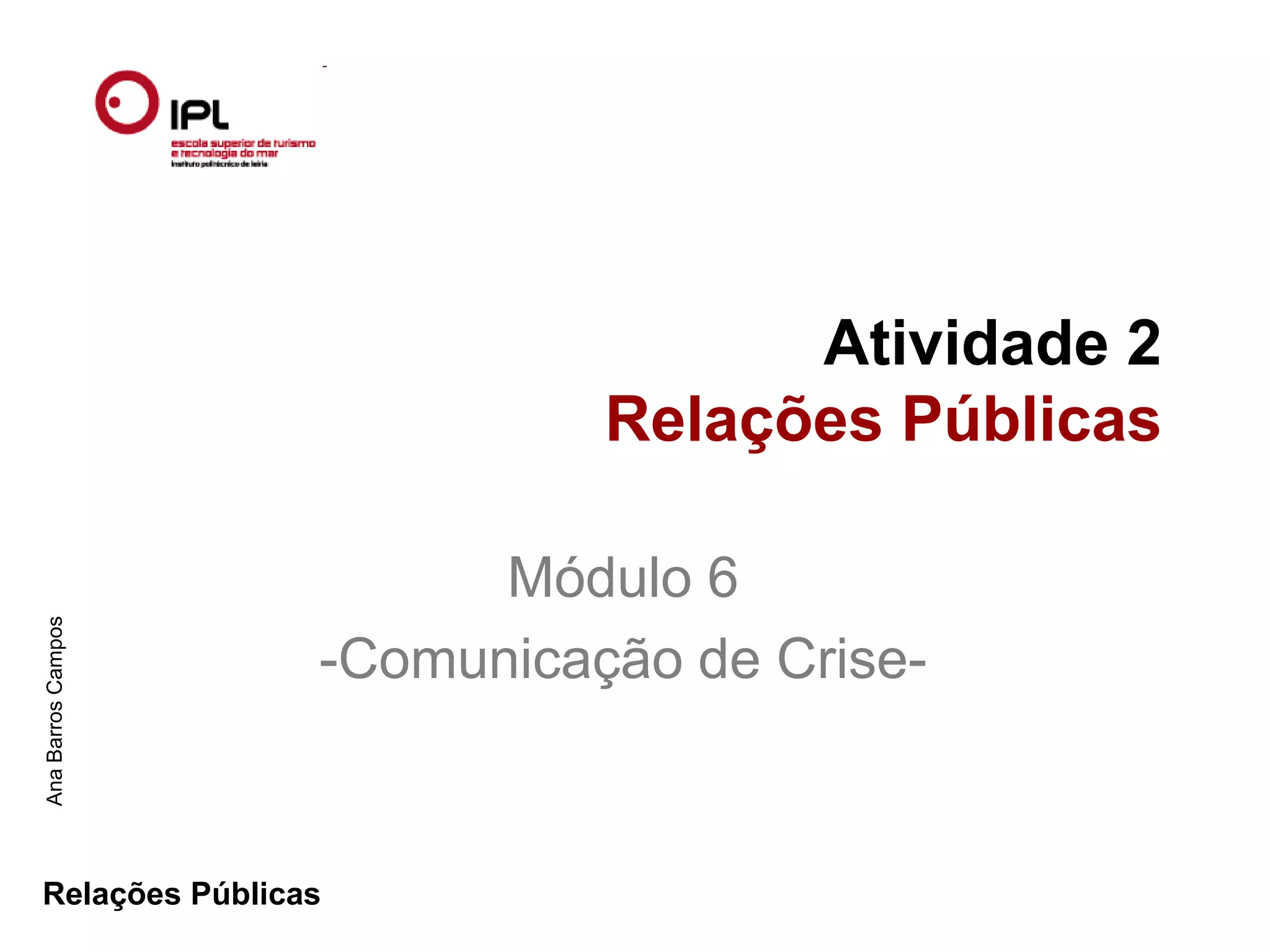 Este documento discute comunicação de crise e relações públicas. Ele explica o que são crises e como as relações públicas podem ajudar a combater situações de crise. Também discute como preparar um plano de comunicação de crise e manual de crise para lidar com crises de forma efetiva.