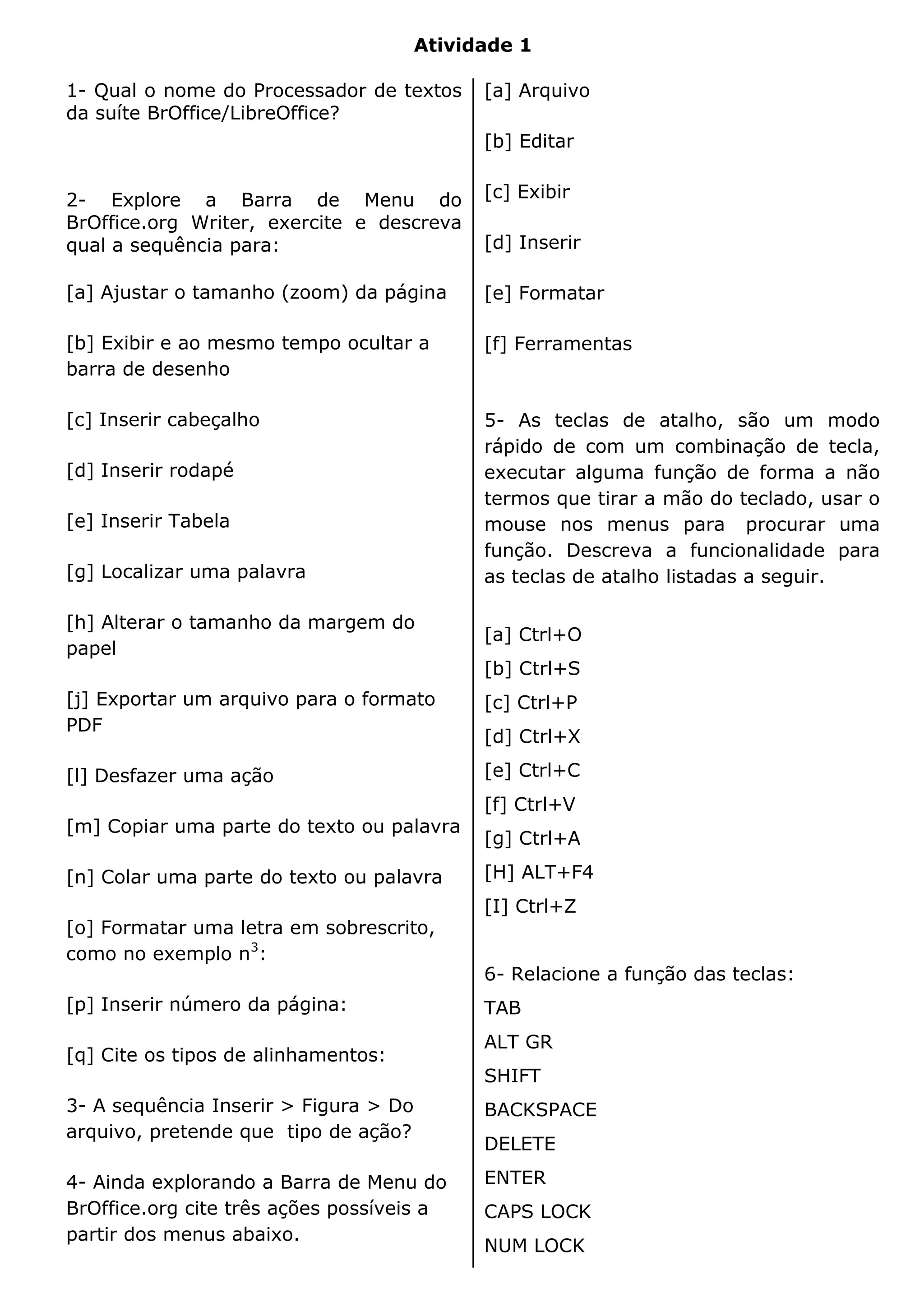 O documento descreve como usar o processador de texto LibreOffice Writer. [1] O nome do processador de texto é Writer. [2] A sequência para ajustar o zoom, exibir/ocultar barra de desenho e inserir cabeçalho é Exibir > Zoom > Barra de Desenho > Inserir > Cabeçalho. [3] A sequência Inserir > Figura > Do arquivo permite inserir imagens do computador no documento.
