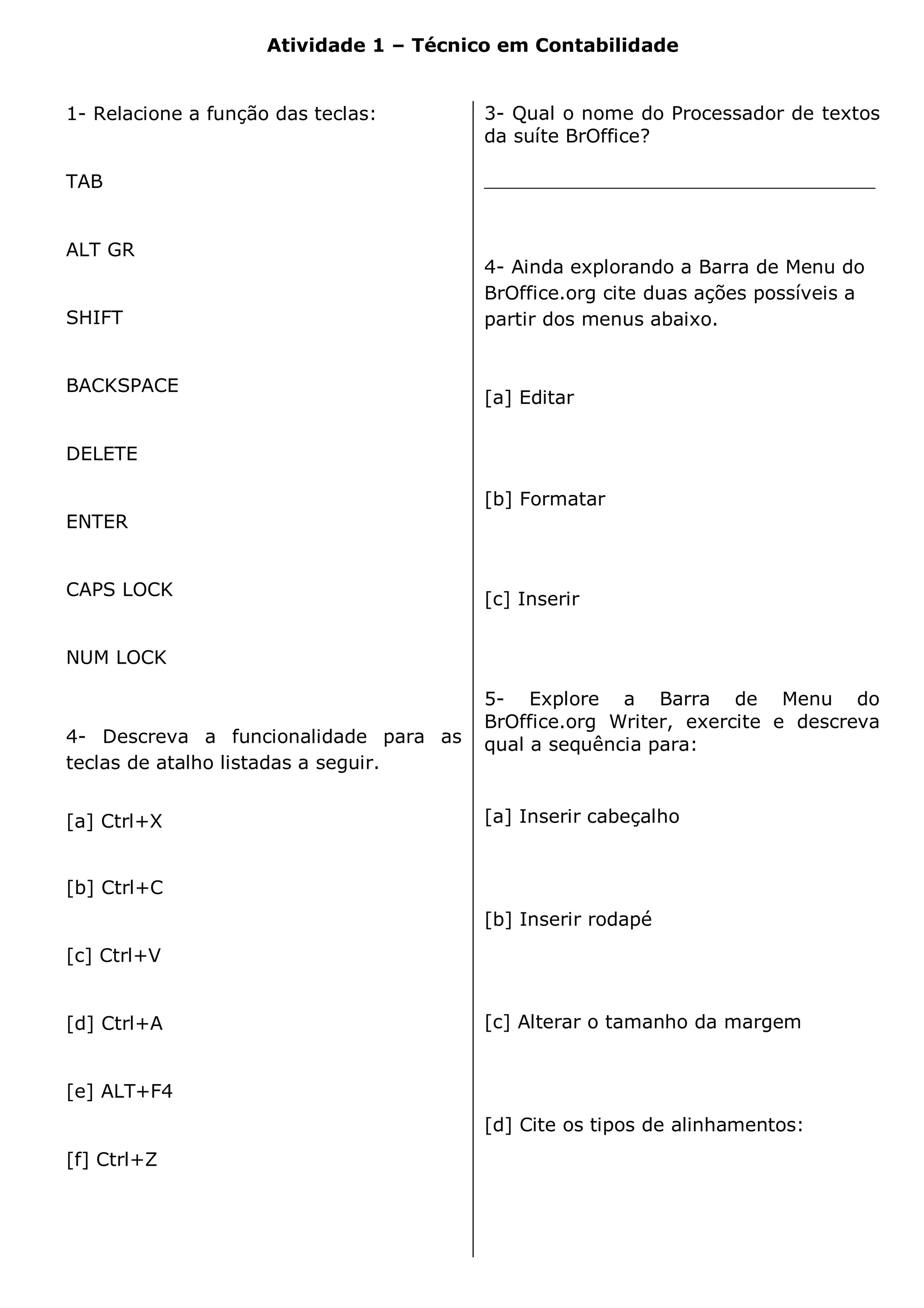O documento descreve exercícios sobre o processador de texto BrOffice.org, incluindo relacionar funções de teclas, nomear o processador de texto, citar ações nos menus e descrever sequências de teclas de atalho para funções como inserir cabeçalho, rodapé e alterar margens.