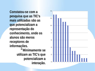 Este documento fornece detalhes sobre as tecnologias da informação e comunicação (TICs) disponíveis em uma escola municipal no Brasil, incluindo 22 televisões, 20 videocassetes, 10 DVDs, 8 computadores para professores e funcionários e 27 computadores em um laboratório de informática. Uma pesquisa mostrou que as TICs mais usadas são aquelas que transmitem informações para os alunos de forma passiva, em vez de estimular a interação. O documento defende que os professores devem usar as novas TICs de forma