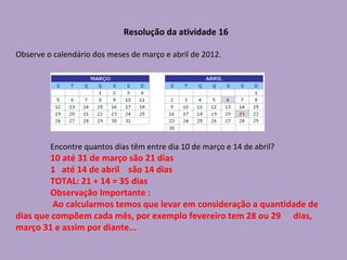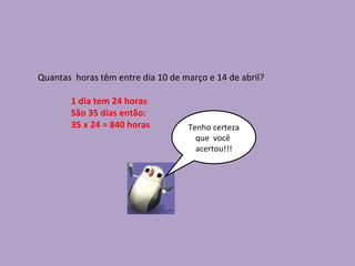 O documento descreve como calcular o número de dias e horas entre 10 de março e 14 de abril de 2012. Foram contados 21 dias em março e 14 dias em abril, totalizando 35 dias. Considerando que cada dia tem 24 horas, multiplicou-se 35 dias por 24 horas para chegar a 840 horas totais entre as datas.