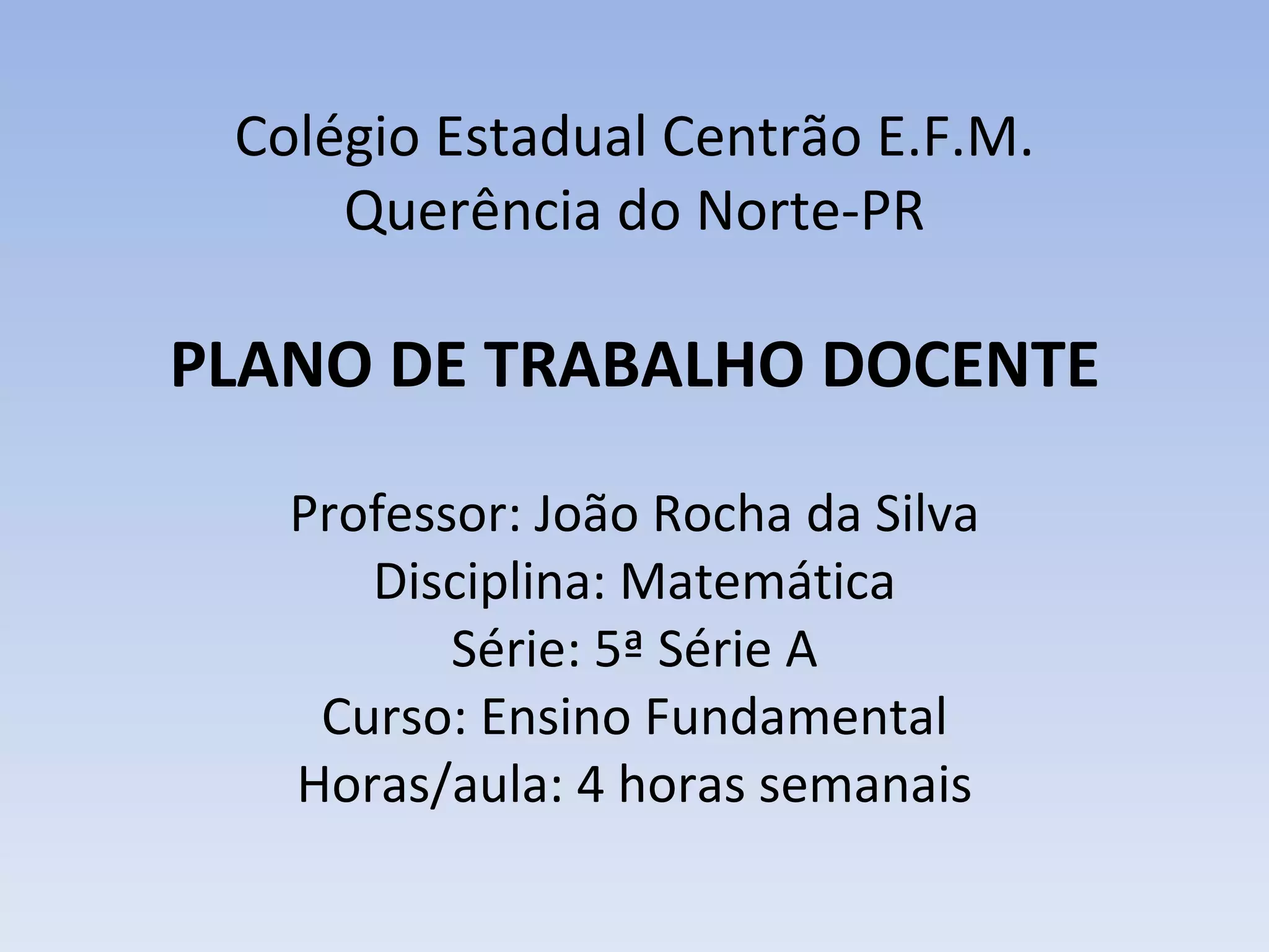 O plano de trabalho do professor João Rocha da Silva para a disciplina de Matemática da 5a série do Ensino Fundamental aborda cálculo mental envolvendo as 4 operações básicas. O objetivo é promover a inclusão digital dos alunos por meio de atividades online em grupo, respeitando diferentes modos de pensar. A metodologia inclui o uso de computadores e links na internet para exercícios de cálculo mental. A avaliação observa a expressão oral e argumentativa dos alunos sobre os conceitos matemáticos.